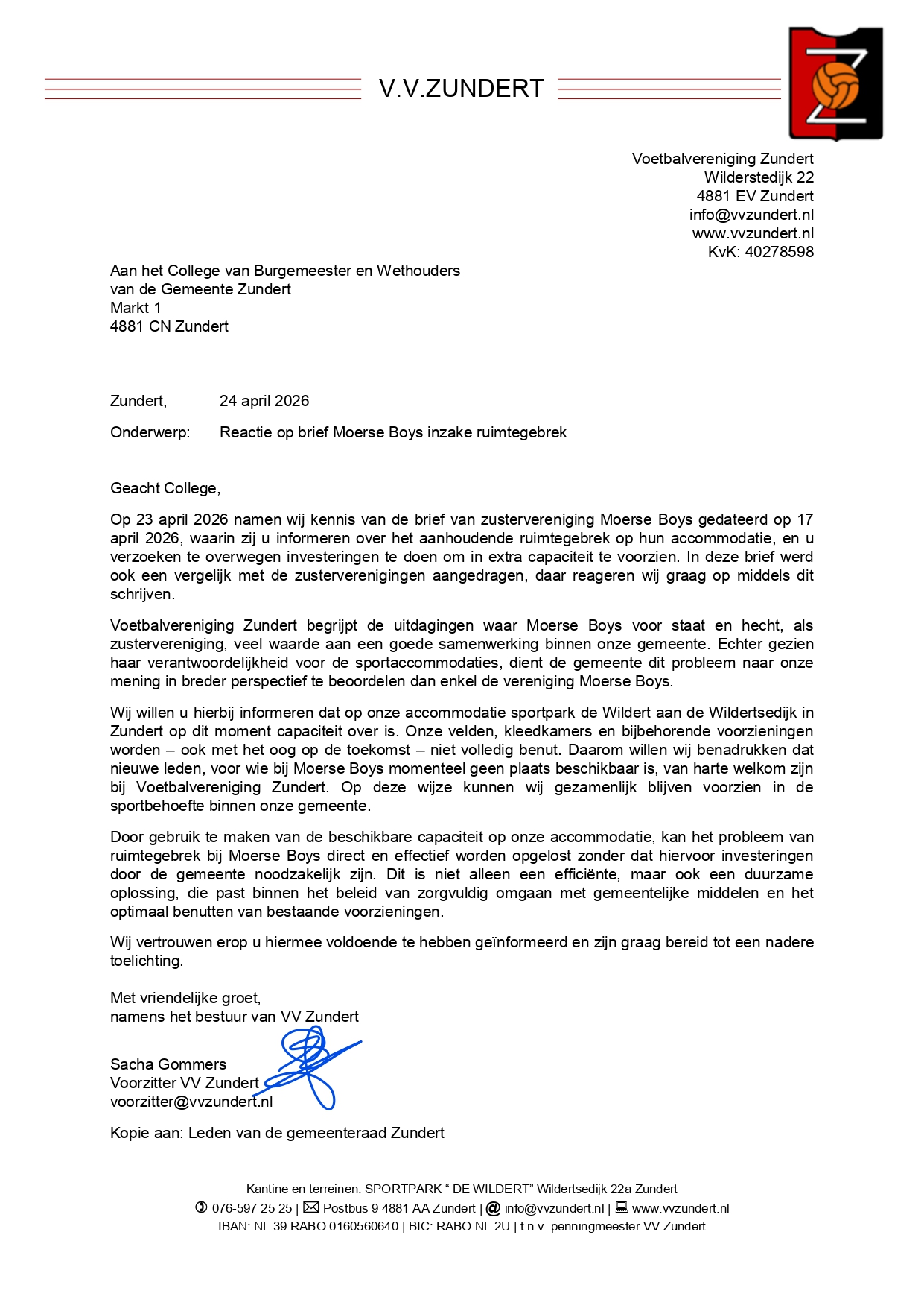 Het bestuur van VV Zundert heeft kennis genomen van de brief aan de gemeente van onze zustervereniging Moerse Boys m.b.t. haar uitbreidingswensen.